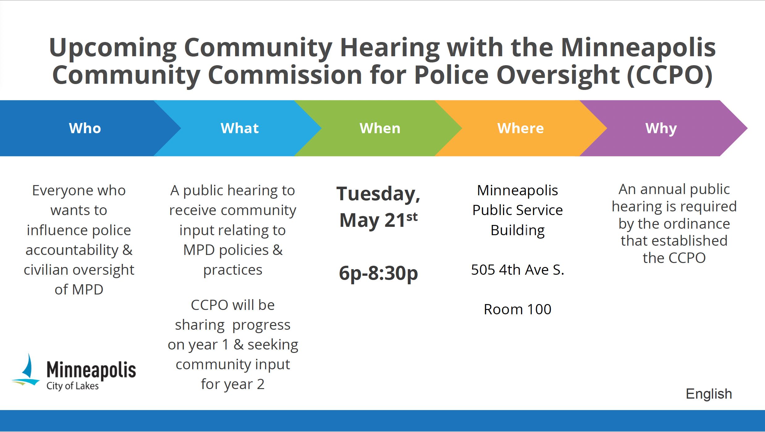 Where: Minneapolis Public Service Building, 500 4th Ave S, Room 100